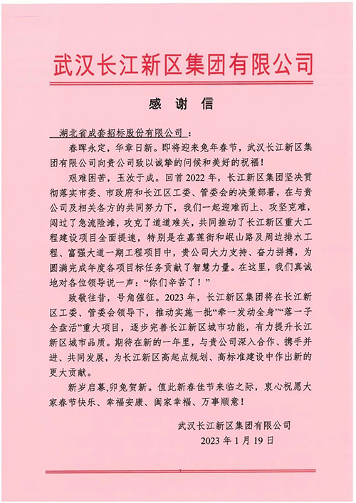近日,taptap,taptap官方网站,taptap登录入口公司收到来自武汉长江新区集团公司(以下简称:长江新区集团)发来的感谢信,对公司在2022年中的招标代理服务给予了高度肯定。
