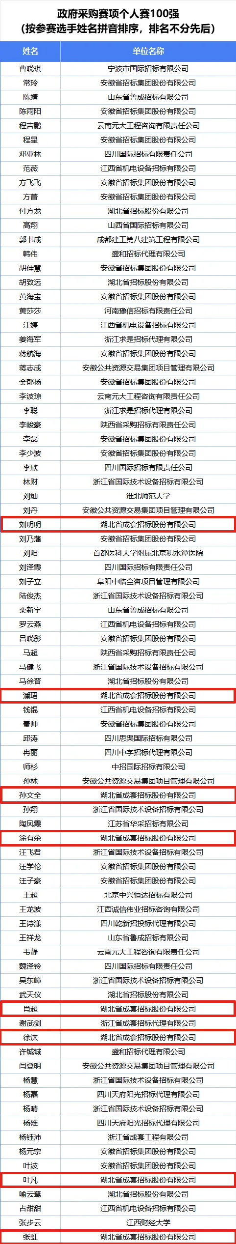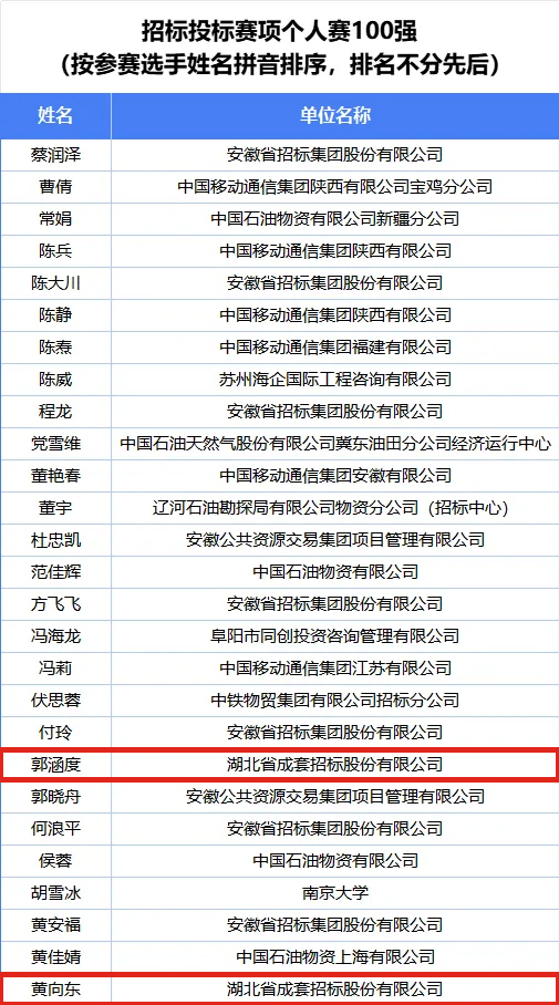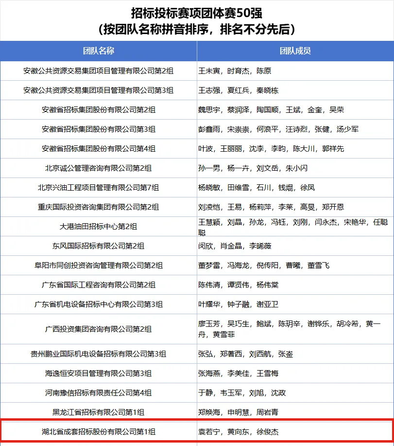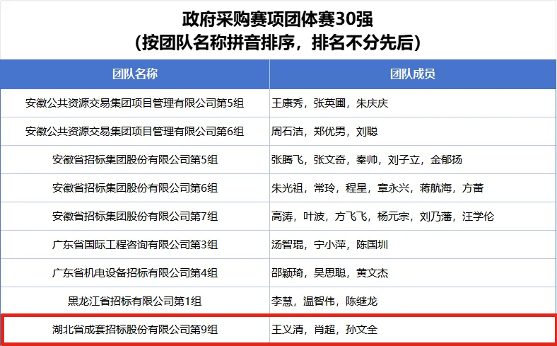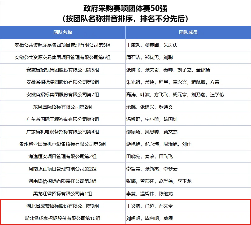 公司第一组团队袁若宁、黄向东、徐俊杰入围全国招标投标赛项团体赛50强榜单;公司第九组团队王义清、肖超、孙文全入围全国政府采购赛项团体赛30强榜单;公司第十组团队刘明明、毕启明、莫程入围全国政府采购赛项团体赛50强榜单;公司参赛选手郭涵度、黄向东入围全国招标投标赛项个人赛100强榜单;公司参赛选手刘明明、潘珺、孙文全、涂有余、肖超、徐沫、叶凡、张虹入围全国政府采购赛项个人赛100强榜单。